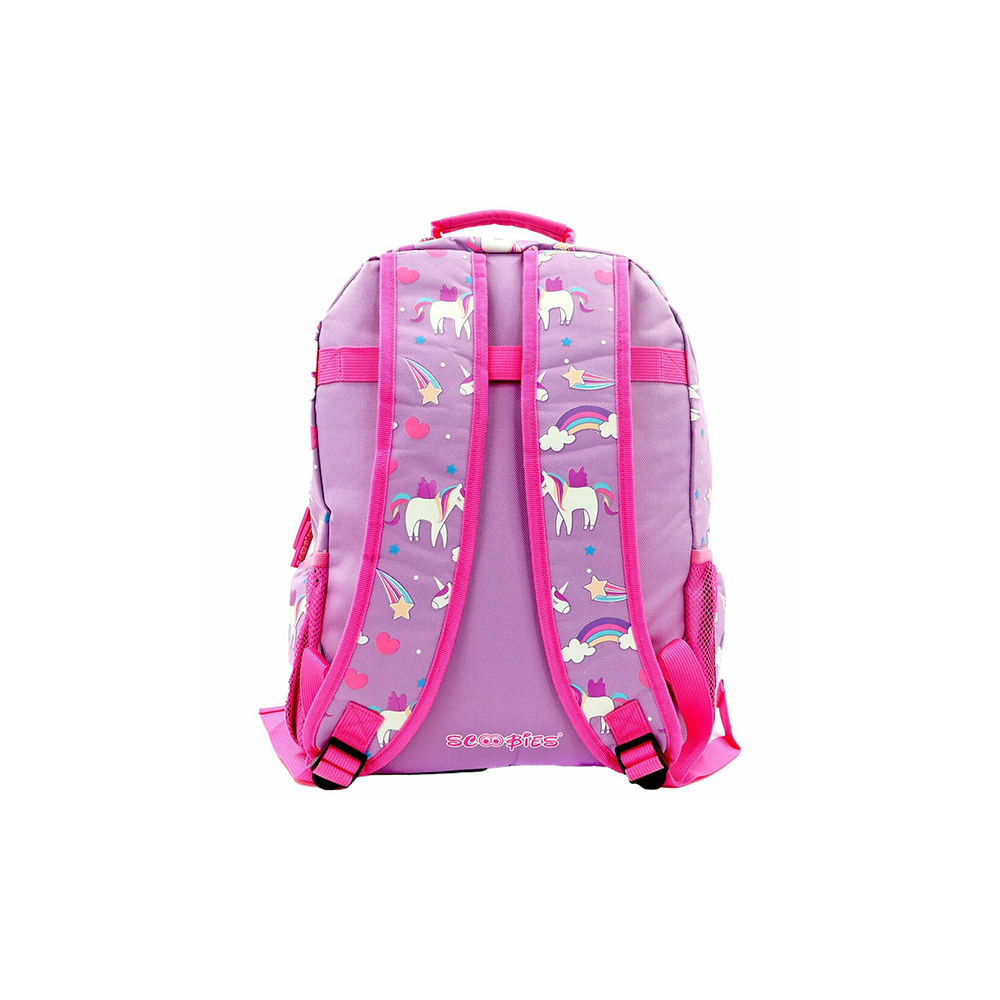- Alluring Design – This pink & purple colored backpack comes with beautiful icons like Unicorn with a pony, hearts, rainbow, and stars along with other cute elements.